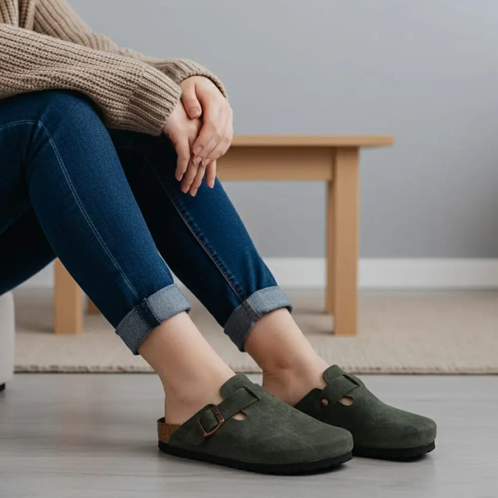 Süet Tokalı Kapalı Kışlık Terlik, klasik konfor terliği stilini kış aylarına uyarlayan, kapalı burunlu ve ayarlanabilir tokalı bir modeldir. Anatomik taban yapısı (mantar taban görünümü) sayesinde gün boyu rahatlık ve doğal bir duruş sunar.