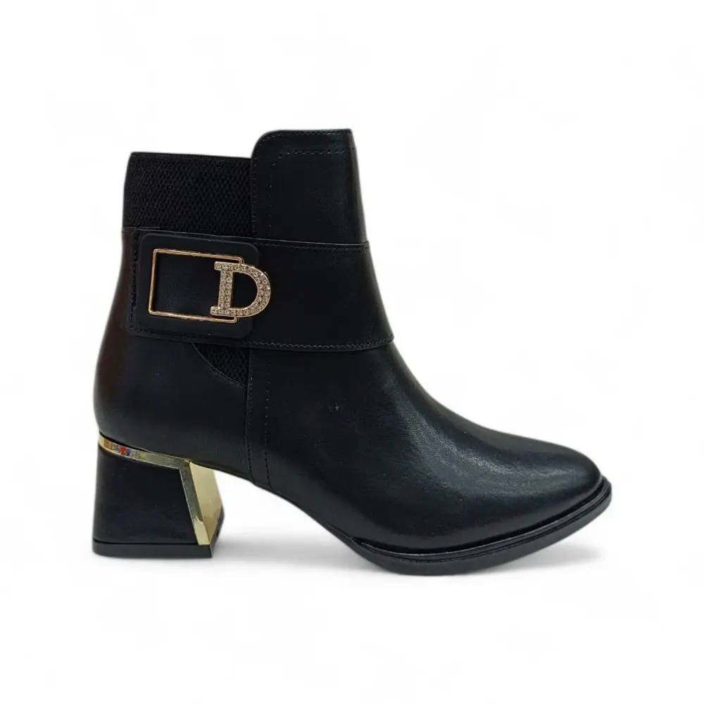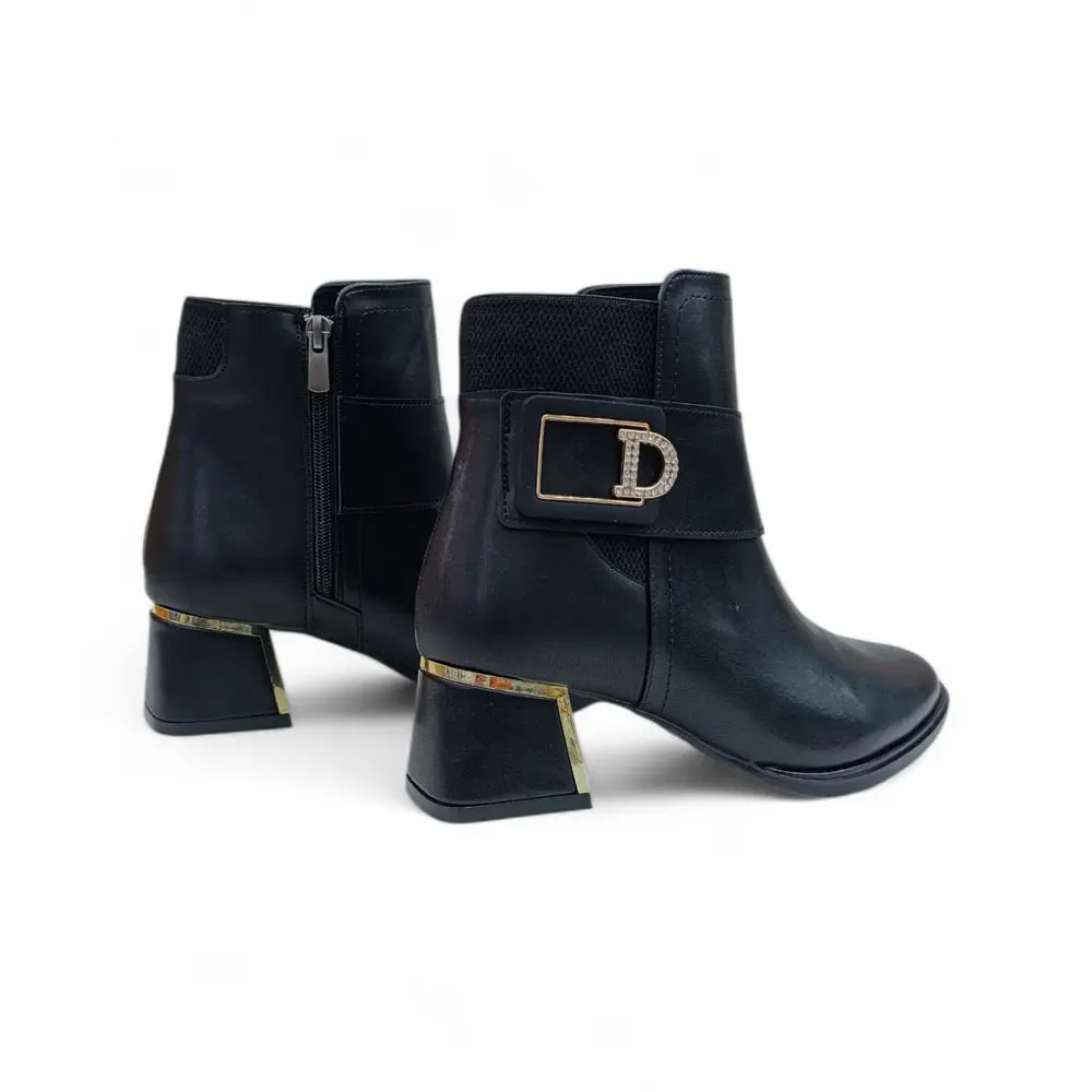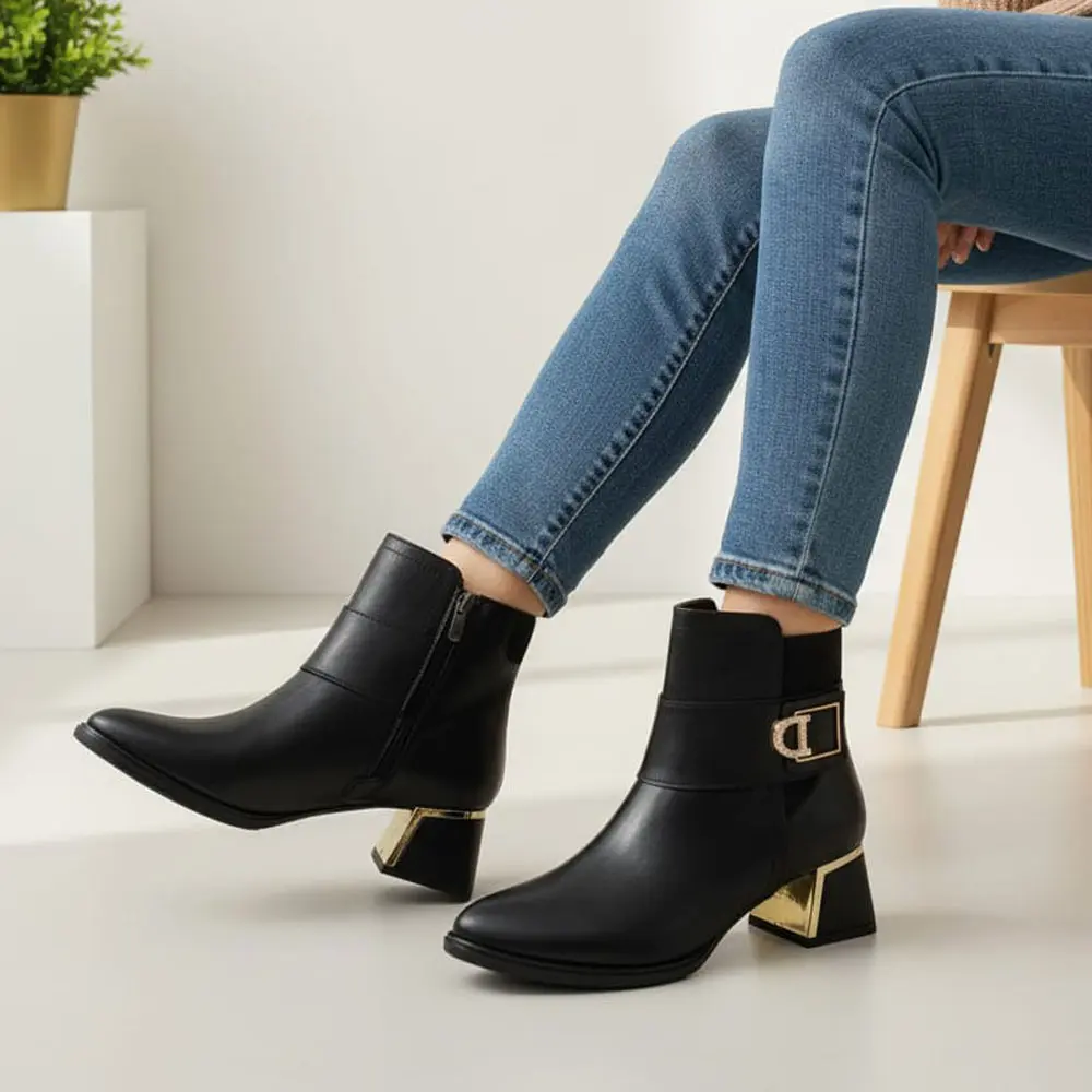Siyah Gold Toka Detaylı Fermuarlı Kadın Topuklu Bot