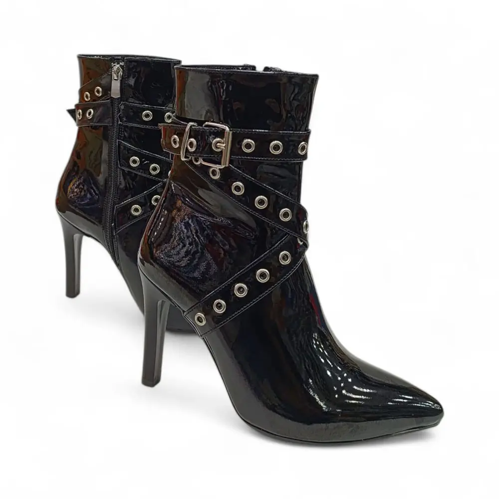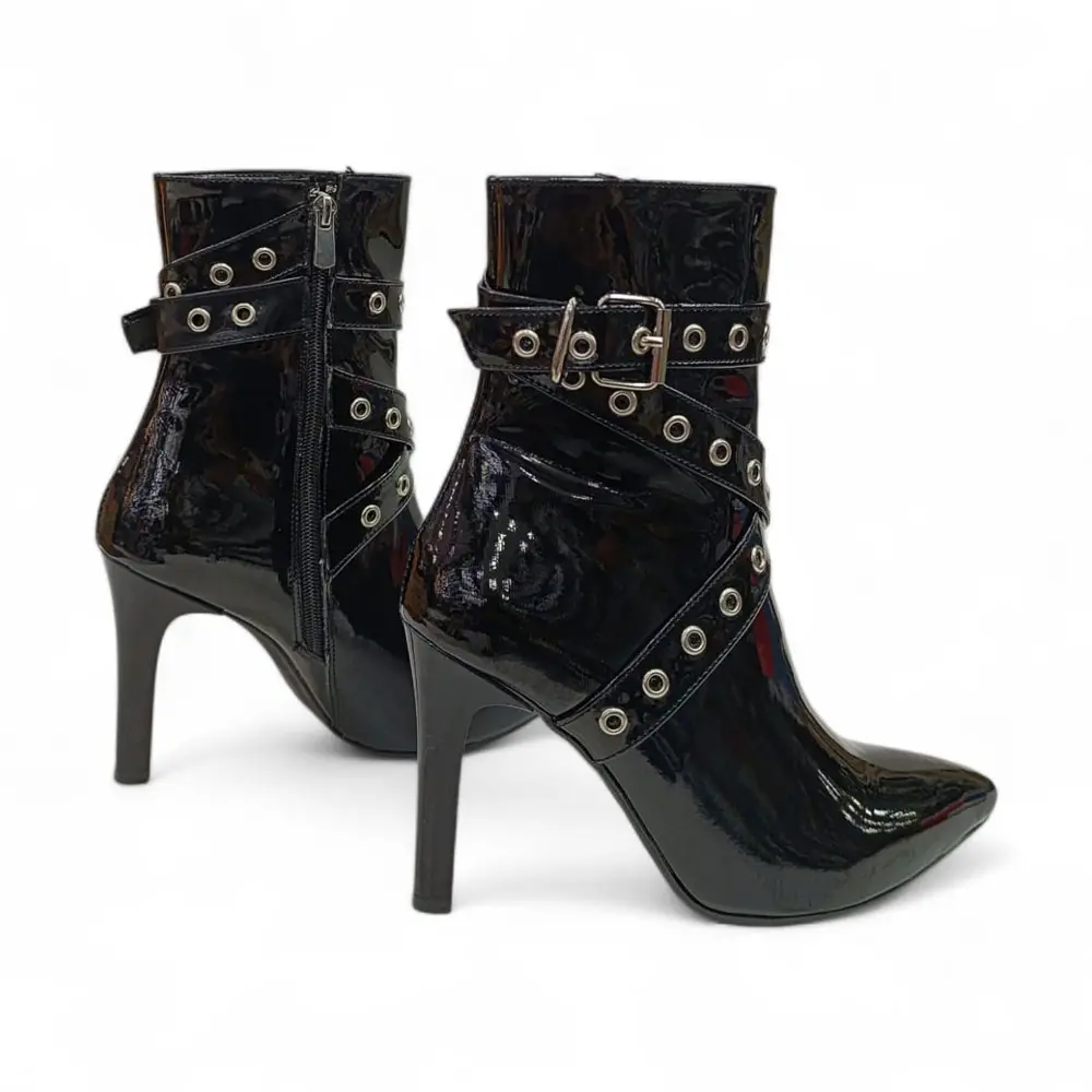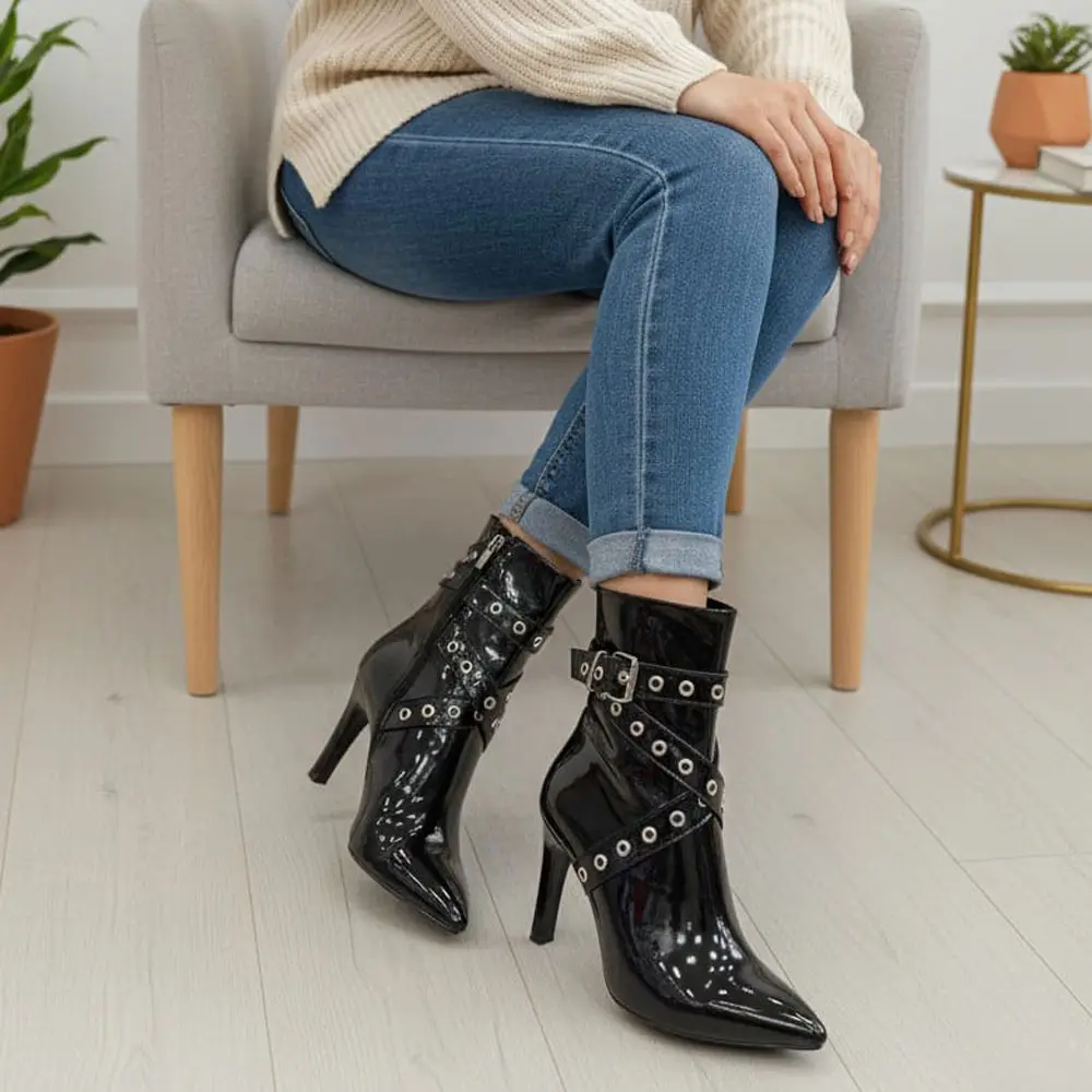 Rugan Toka Detaylı Yüksek Topuklu Kadın Bot, parlak rugan dokusu, göz alıcı metal aksesuarları ve yüksek ince topuğu ile cesur ve iddialı bir stilin anahtarıdır. Gece şıklığı ve dikkat çekici kombinler için mükemmel bir tercihtir.