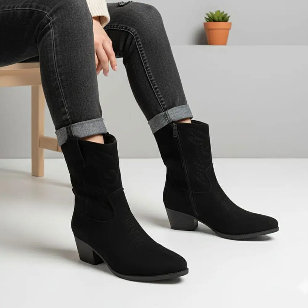 Kovboy botu, klasik Western tarzının ince nakış detaylarını modern ve giyilebilir bir silüetle buluşturur. Yumuşak süet dokusu ve dengeli topuğu sayesinde, mevsimlik kombinlerinize zahmetsizce otantik bir hava katarken gün boyu rahatlık sunar.