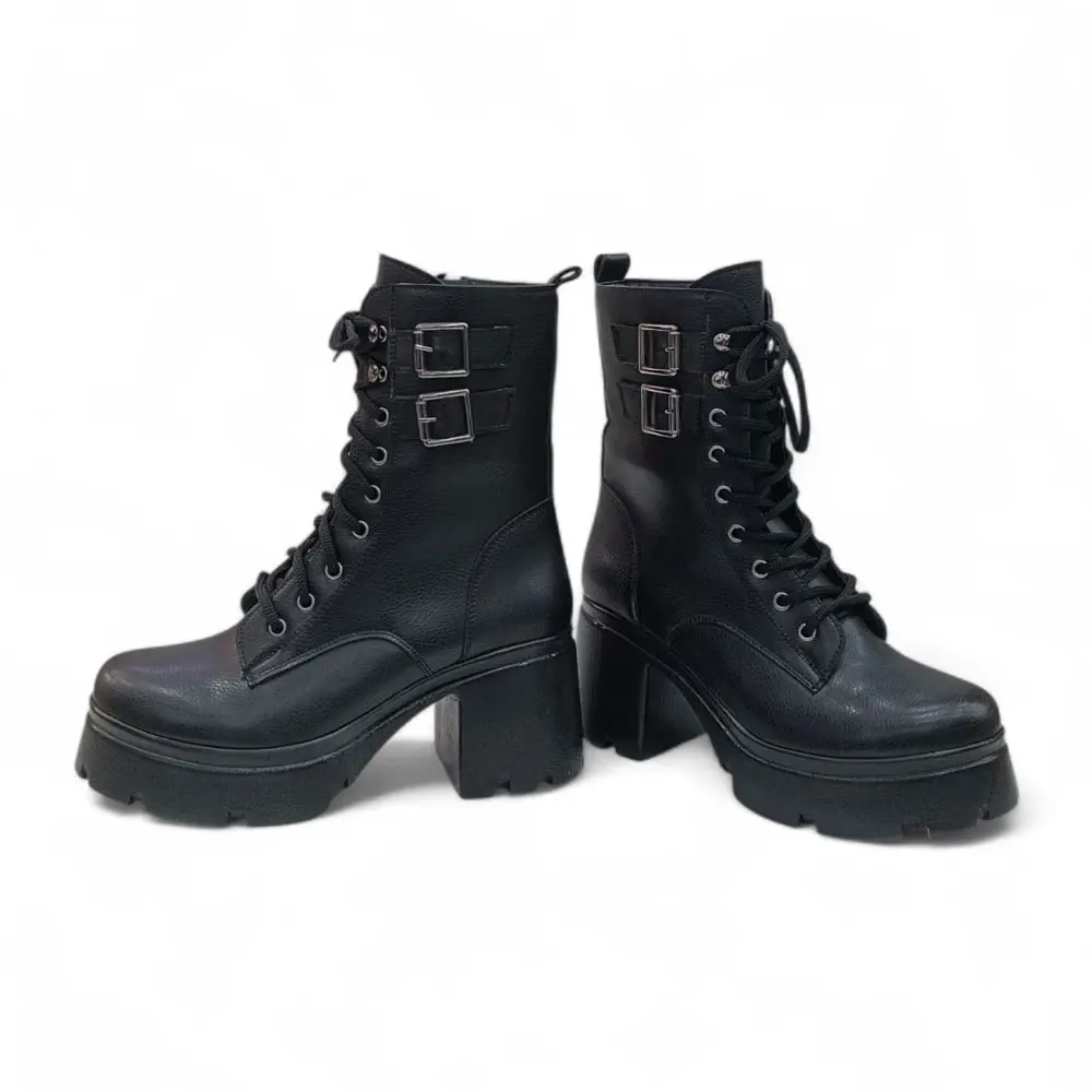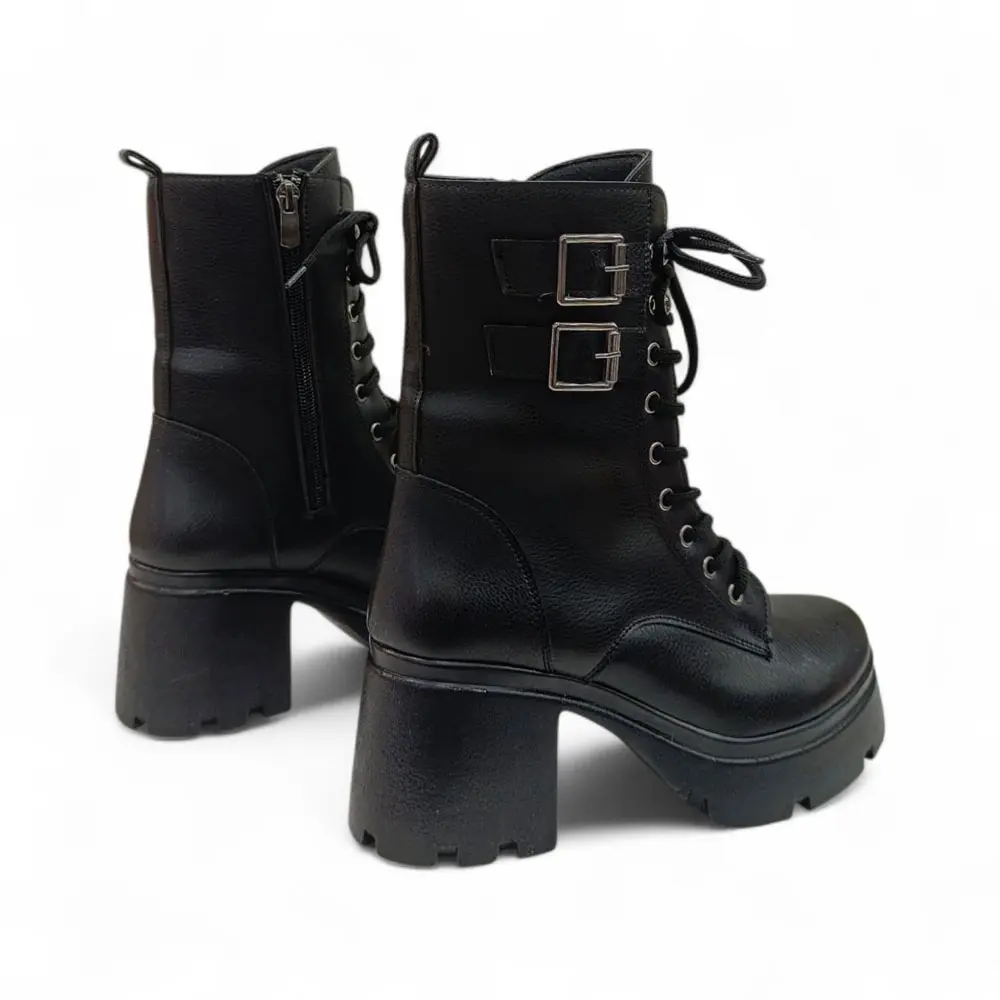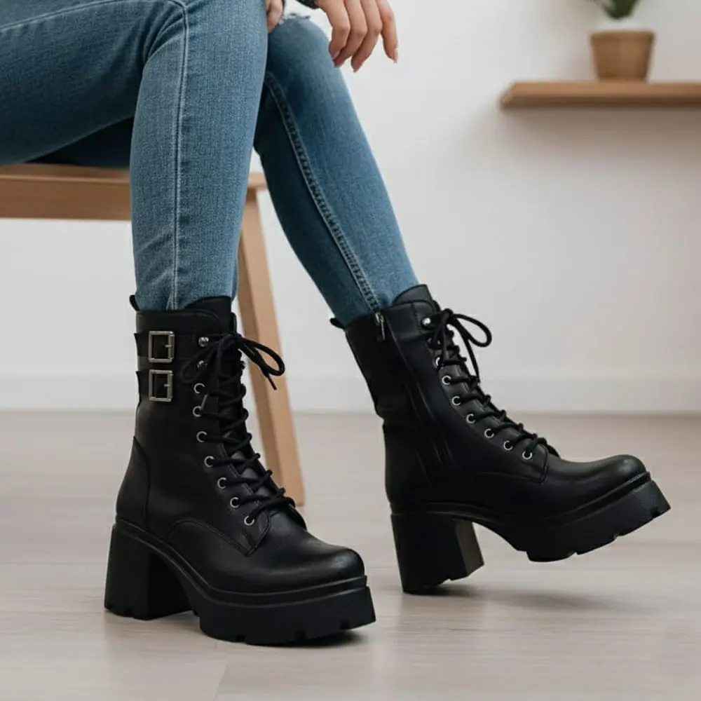 Bağcıklı Toka Detaylı Kalın Topuklu Kadın Bot, kalın dişli tabanı, yüksek ve dengeli topuğu ile güçlü ve trend bir duruş sergiliyor. Bağcık ve toka detayları, modele dinamik ve "grunge" bir hava katarken, yüksek konforu sayesinde günlük stilinizden ödün vermezsiniz.
