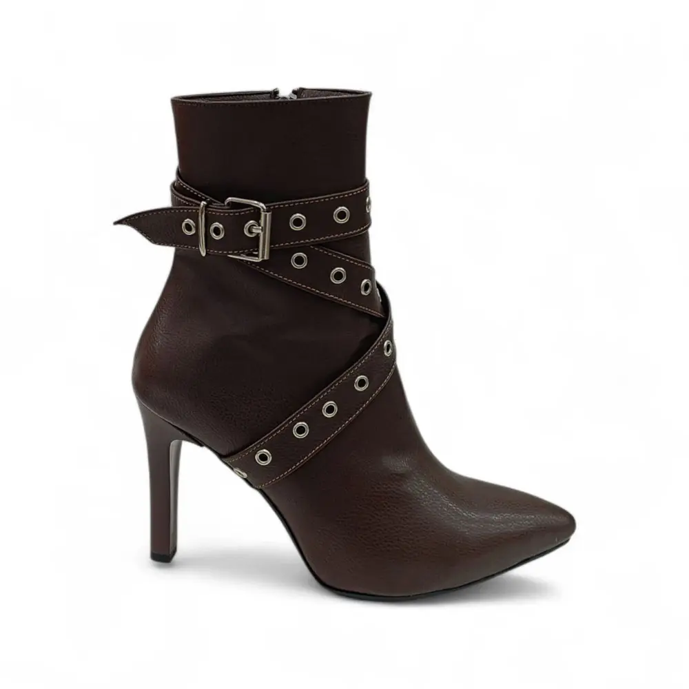 Sivri Burunlu Metal Detaylı Yüksek Topuklu Kadın Bot, klasik ve feminen bot silüetini, bilek kısmındaki cesur metal halka (kuşgözü) ve bant detaylarıyla birleştiriyor. Yüksek ince topuğu ve keskin sivri burun formu ile bacakları uzun gösteren, iddialı bir duruş sergiler.