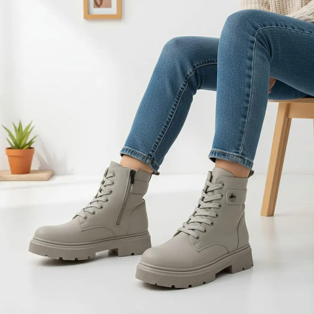 Bu kısa bot modeli, kalın ve tırtıklı tabanı ile modern bir duruş sergilerken, zarif kemer ve toka detayları ile klasik postal stiline hareket katmaktadır. Sonbahar ve kış kombinlerinin vazgeçilmezi olan bu model, şıklığı ve fonksiyonelliği bir arada sunar.
