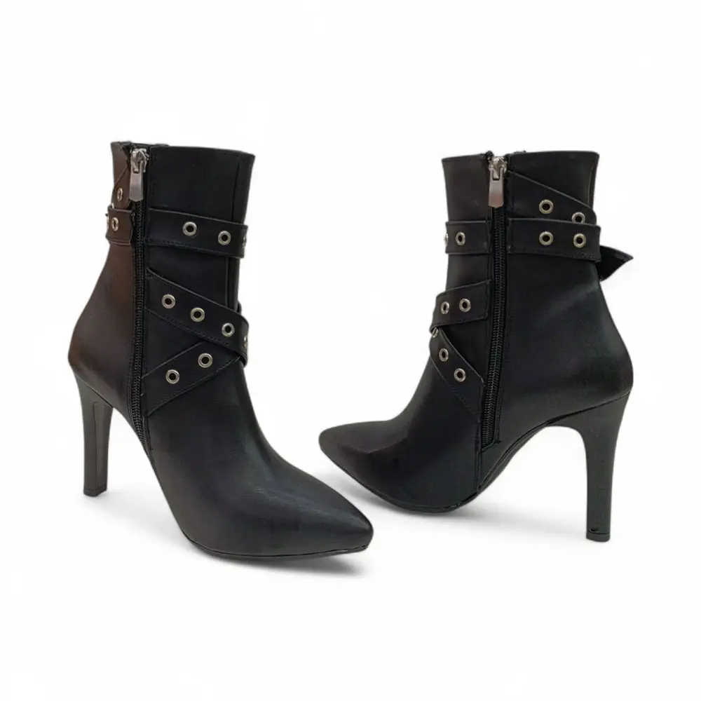 Asi Detaylar: Bilek kısmını saran çapraz bantlar üzerindeki metal kuşgözü (halka) ve ayarlanabilir toka detayları, modele rock chic ve asi bir hava katarak klasik topuklu botların dışına çıkarır.