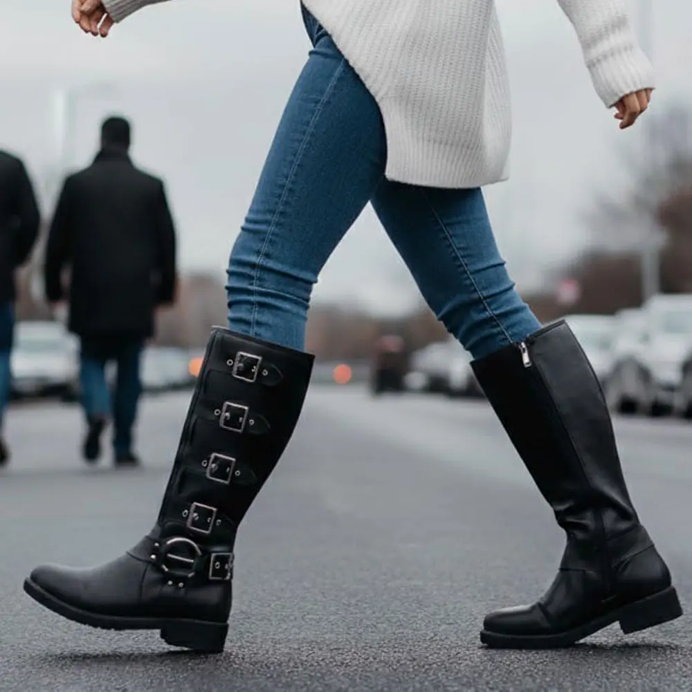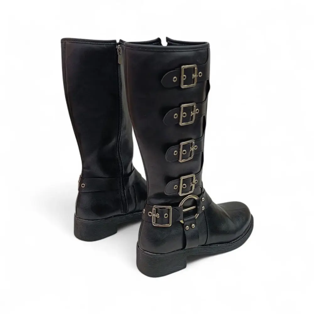 Çoklu Toka Detaylı Diz Altı Kadın Çizme, klasik çizmelerin zarifliğini, asi metal tokaların dinamizmi ve kalın tabanın konforuyla birleştiriyor. Yüksek şıklığı ve güçlü karakteriyle, kış aylarında fark yaratmak isteyenler için mükemmel bir tercihtir.