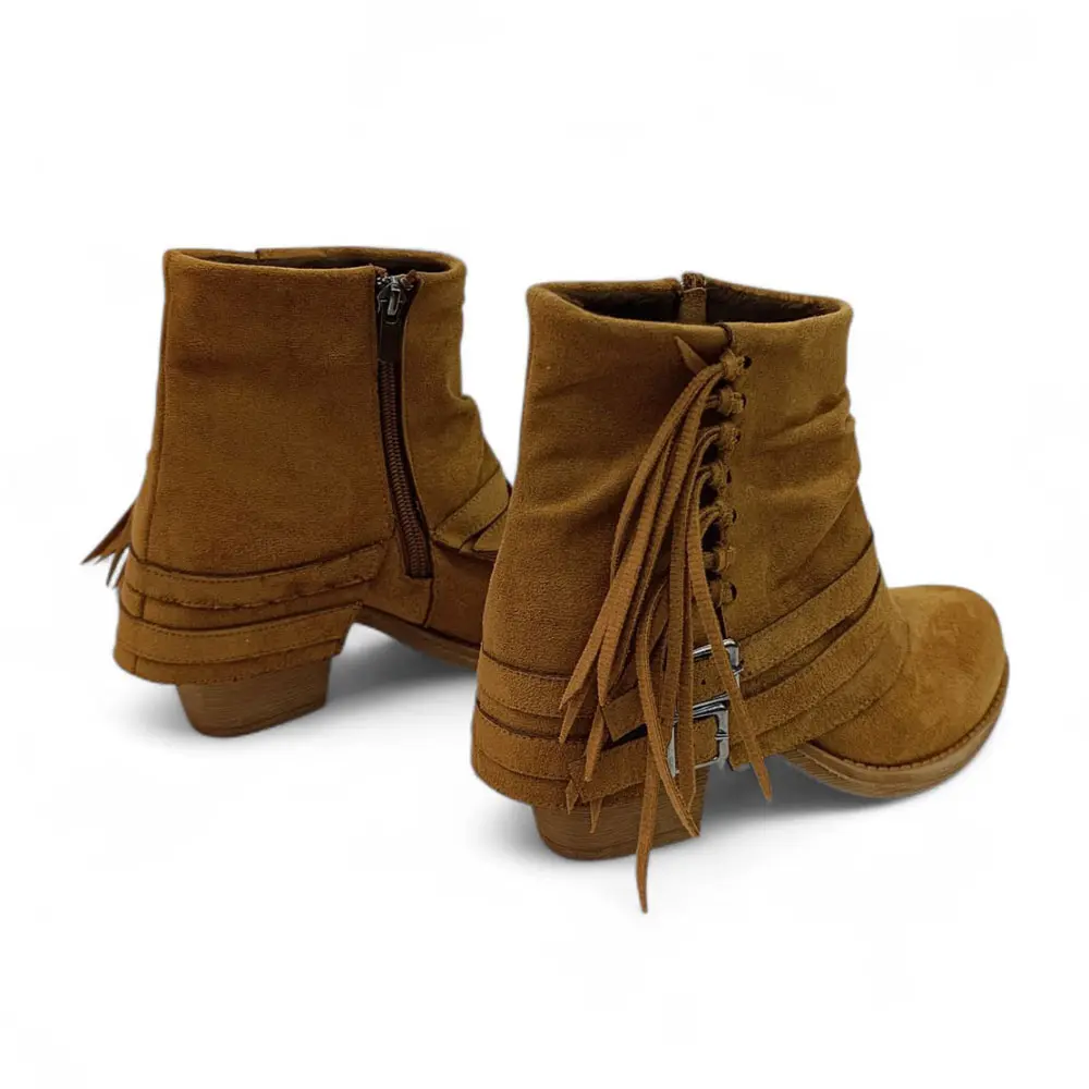 Tasarım Detayları: Botun yan kısmında, bileği saran kemer detayının yanından sarkan uzun püsküller ve dekoratif tokalar, modele dinamik ve dikkat çekici bir bohem hava katar.