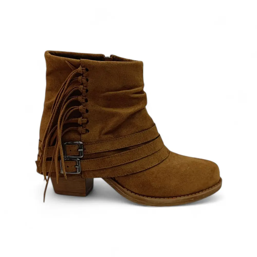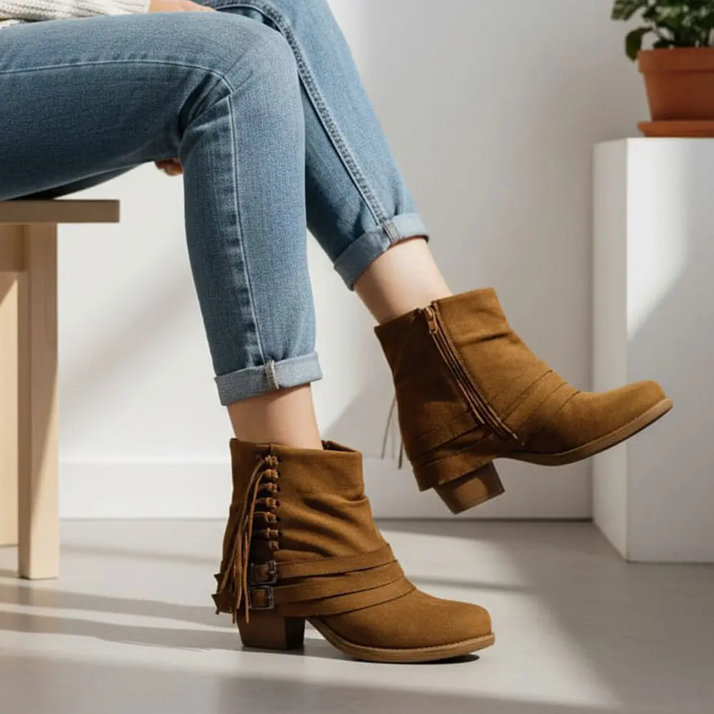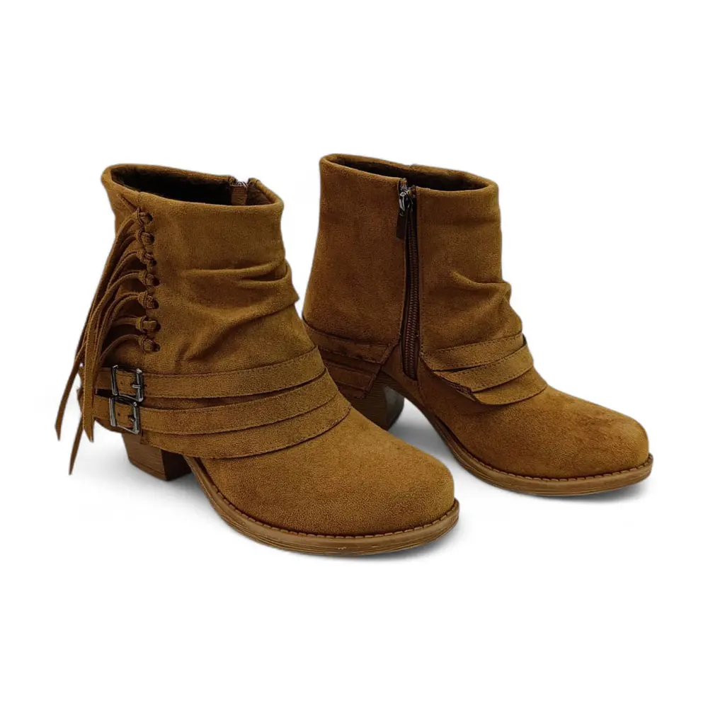 Bilek çevresindeki hareketli püskül ve kemer detaylarıyla bohem ve Western esintilerini bir araya getirir. Rahat kalın topuk yapısı ve yumuşak süet dokusu sayesinde dört mevsim stilinize sıcaklık ve karakter katar.