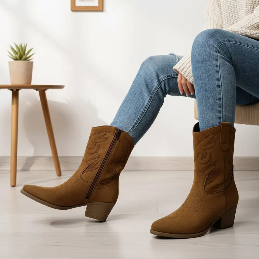 Kovboy botu, klasik Western tarzının ince nakış detaylarını modern ve giyilebilir bir silüetle buluşturur. Yumuşak süet dokusu ve dengeli topuğu sayesinde, mevsimlik kombinlerinize zahmetsizce otantik bir hava katarken gün boyu rahatlık sunar.