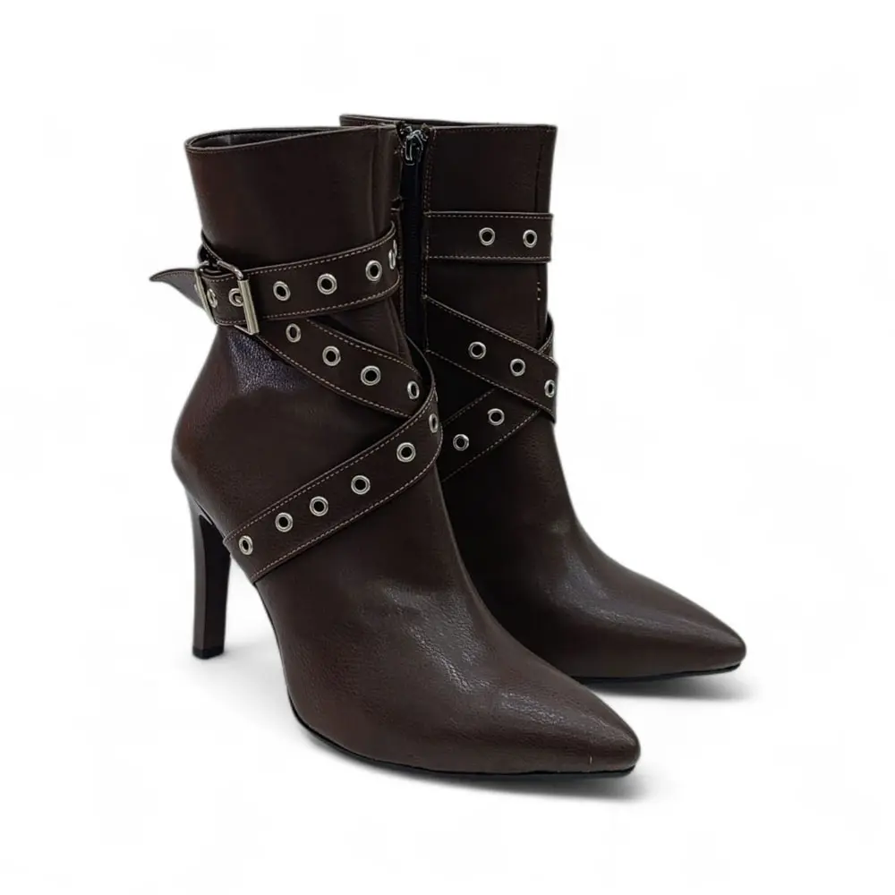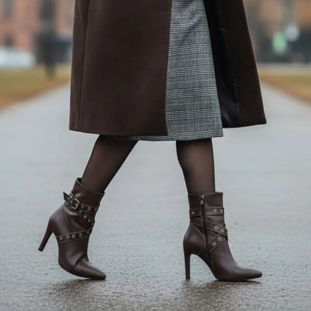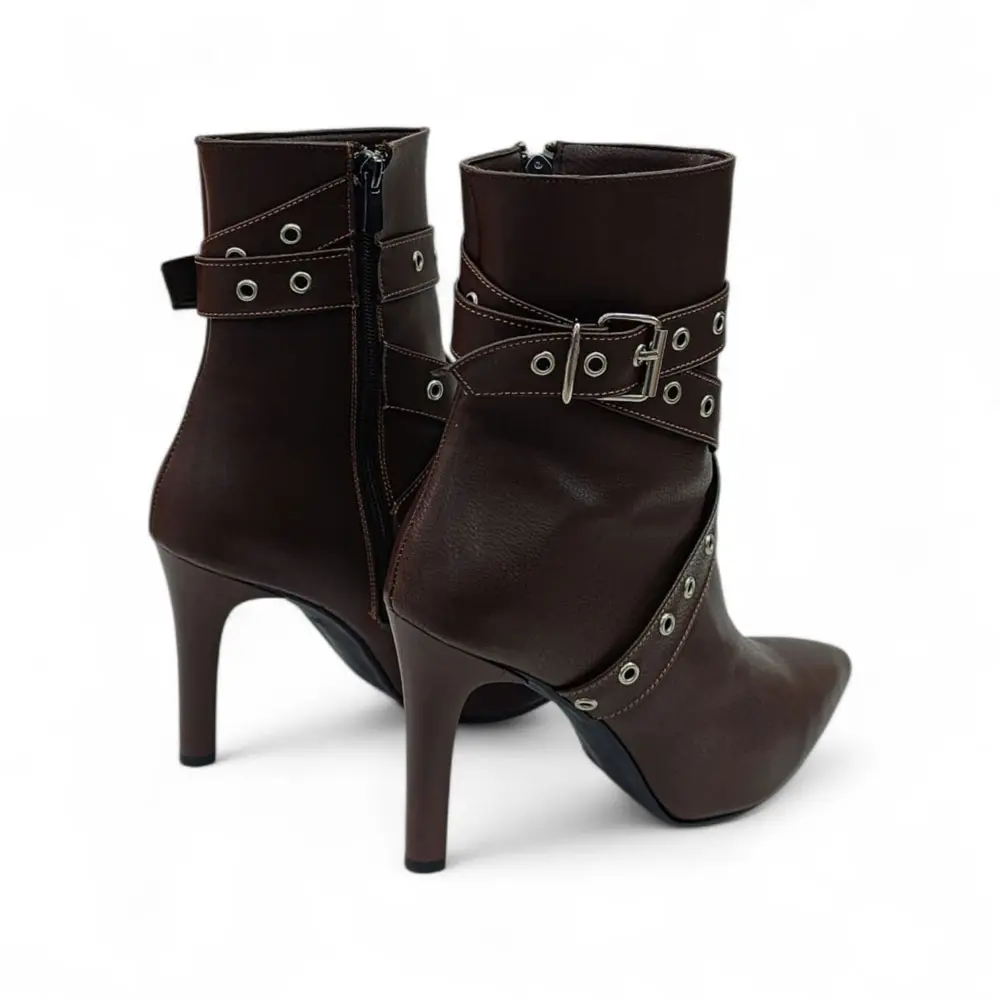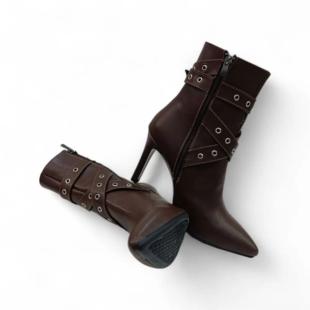 Sivri Burunlu Metal Detaylı Yüksek Topuklu Kadın Bot, klasik ve feminen bot silüetini, bilek kısmındaki cesur metal halka (kuşgözü) ve bant detaylarıyla birleştiriyor. Yüksek ince topuğu ve keskin sivri burun formu ile bacakları uzun gösteren, iddialı bir duruş sergiler.