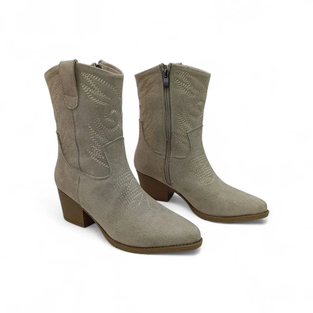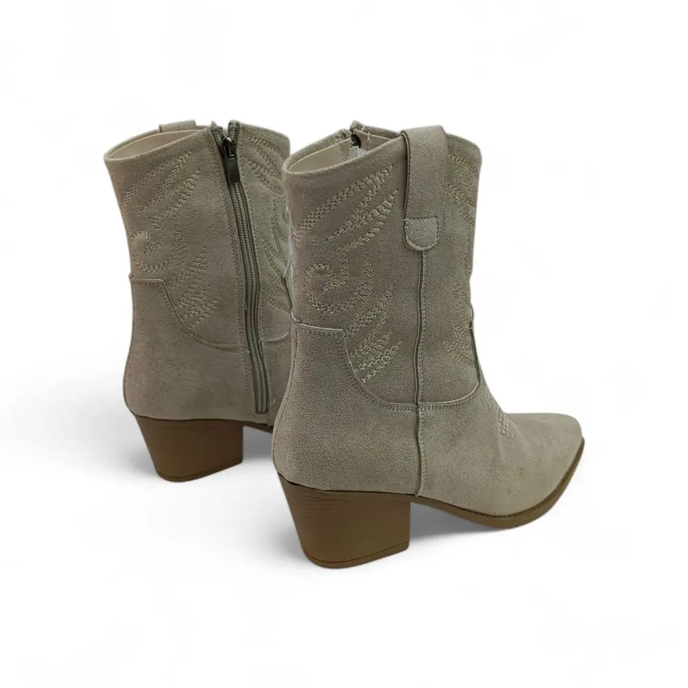 Kovboy botu, klasik Western tarzının ince nakış detaylarını modern ve giyilebilir bir silüetle buluşturur. Yumuşak süet dokusu ve dengeli topuğu sayesinde, mevsimlik kombinlerinize zahmetsizce otantik bir hava katarken gün boyu rahatlık sunar.