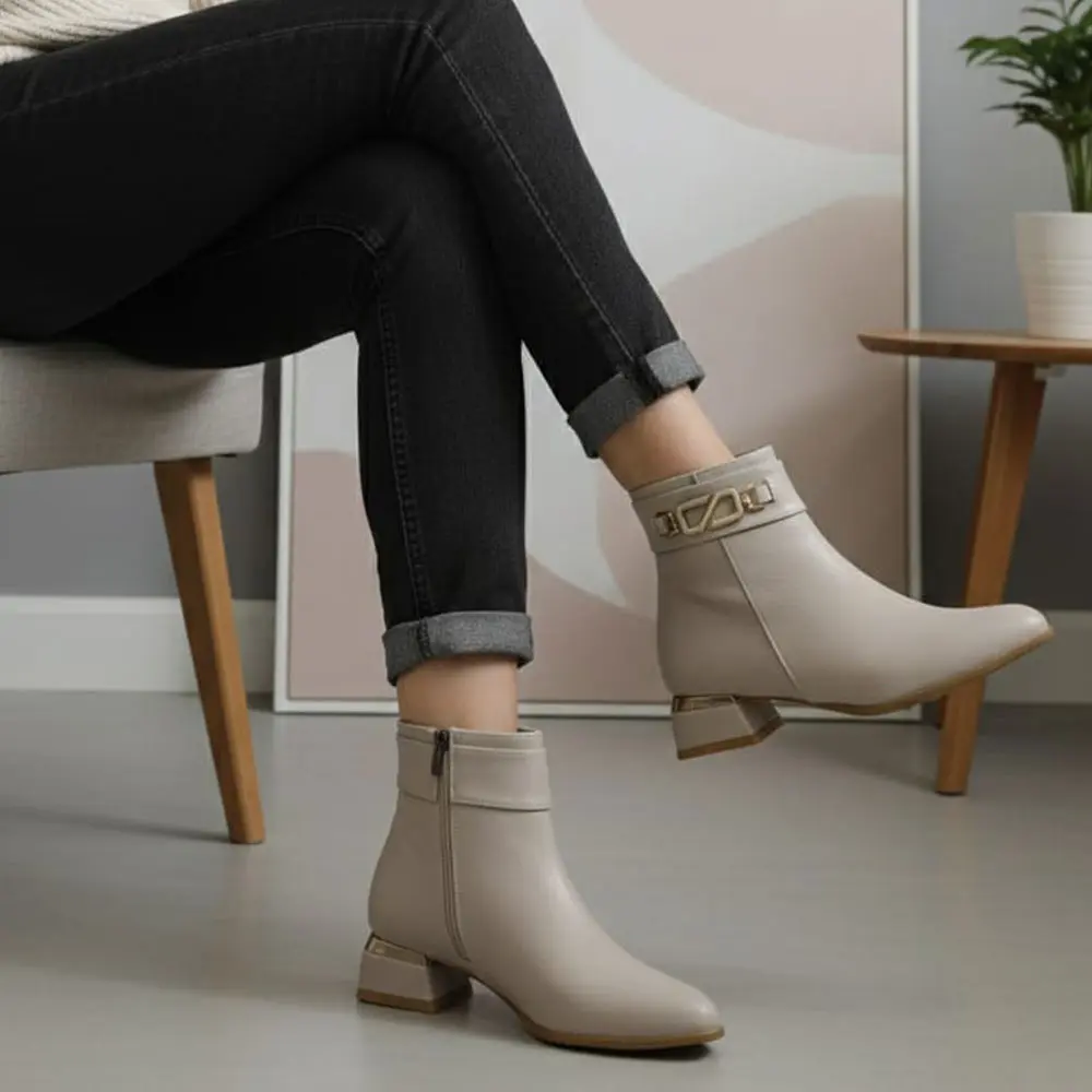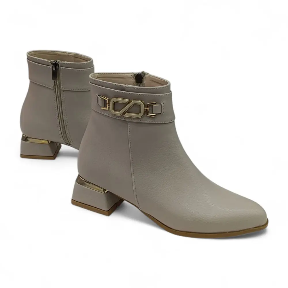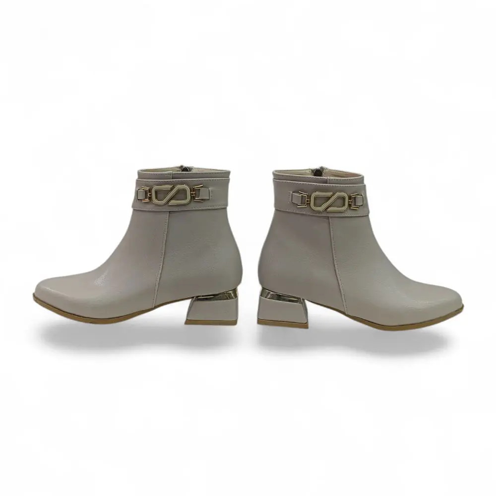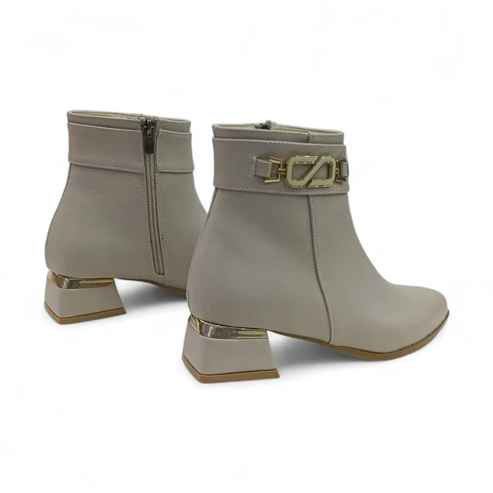 Bej Taş Detaylı Yandan Fermuarlı Kısa Topuklu Kadın Bot, modern tasarımı ve konforlu yapısıyla günlük şıklığınızın vazgeçilmezi olmaya aday. Şık altın rengi tokası ve kısa, dengeli topuğu ile hem estetik hem de rahat bir kullanım sunar.