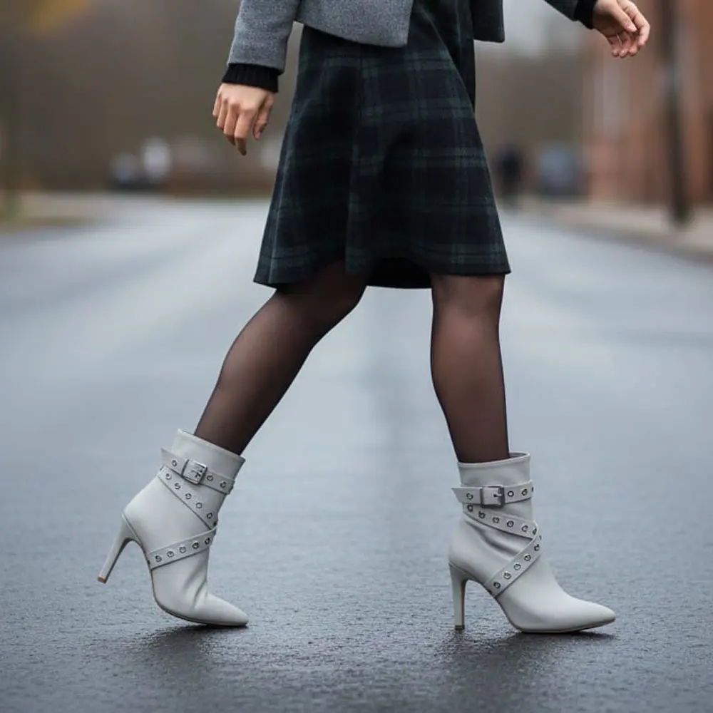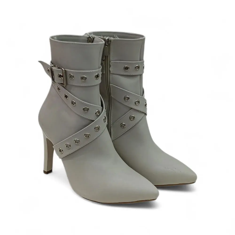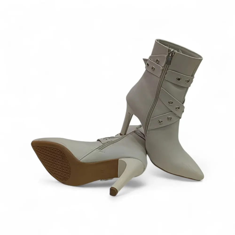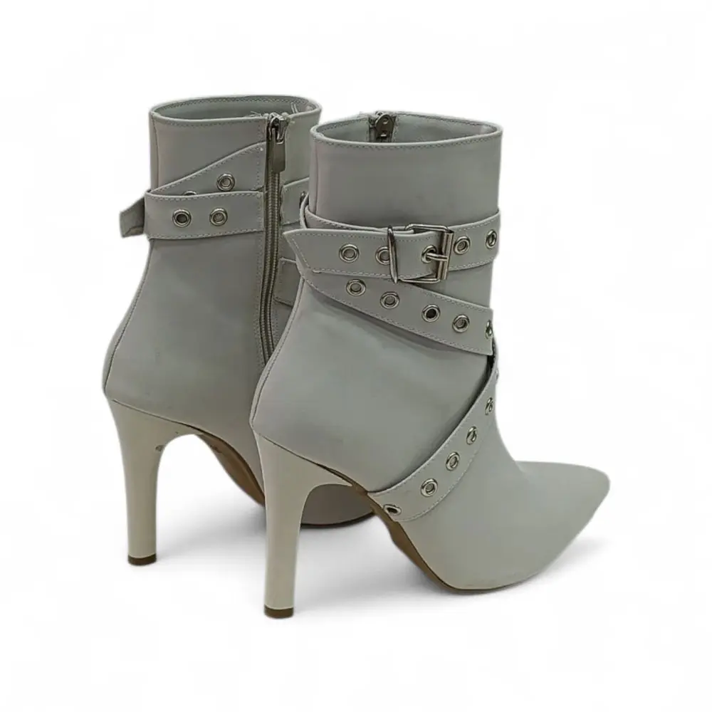 Sivri Burunlu Metal Detaylı Yüksek Topuklu Kadın Bot, klasik ve feminen bot silüetini, bilek kısmındaki cesur metal halka (kuşgözü) ve bant detaylarıyla birleştiriyor. Yüksek ince topuğu ve keskin sivri burun formu ile bacakları uzun gösteren, iddialı bir duruş sergiler.