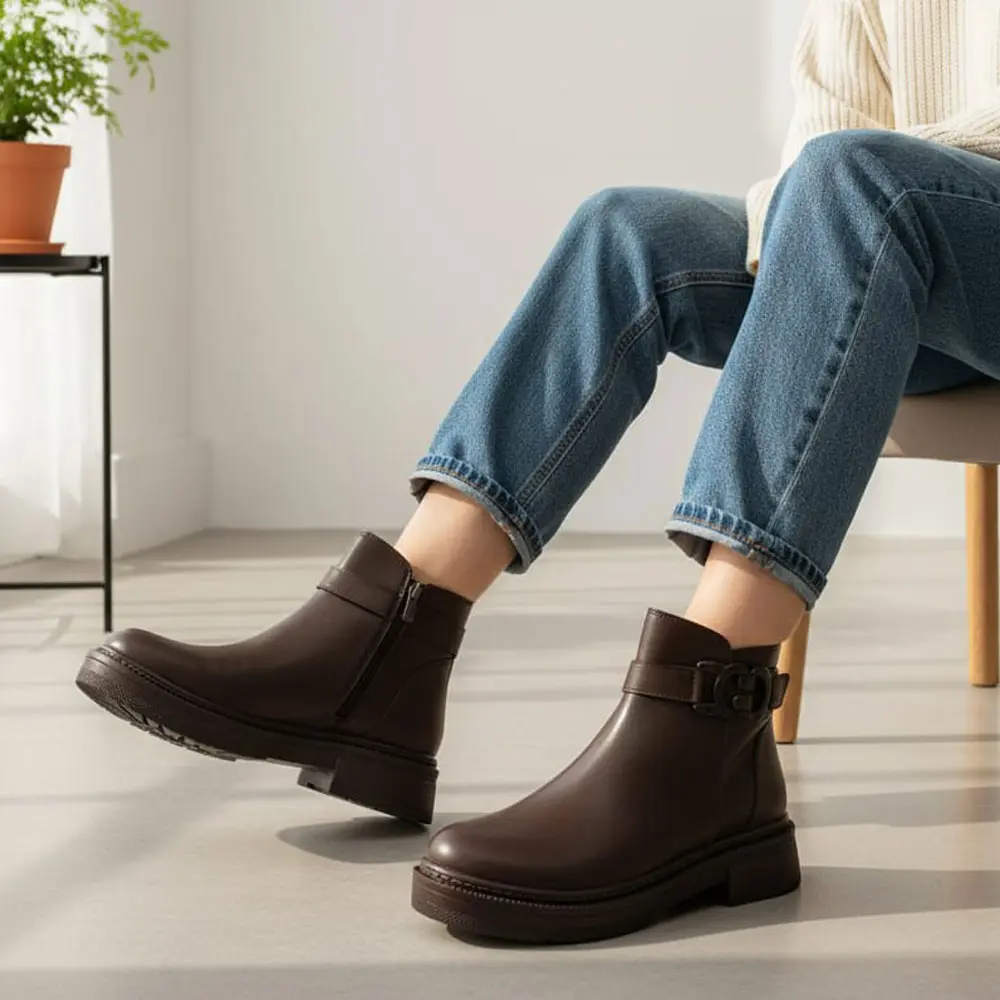 kadın bot modeli, günlük rahatlığı modern detaylarla birleştirerek sonbahar ve kış aylarının şık ve konforlu bir alternatifi olarak öne çıkmaktadır. Kalın, alçak tabanı ve göz alıcı toka detayı ile her kombine dinamik bir hava katar.