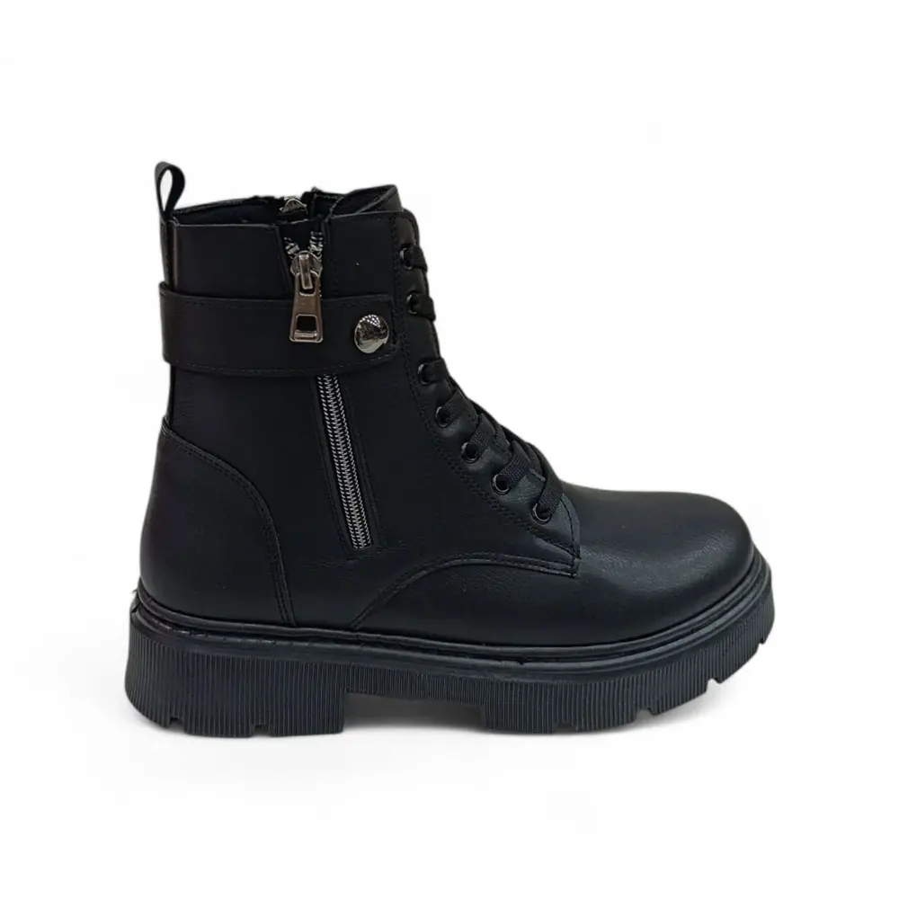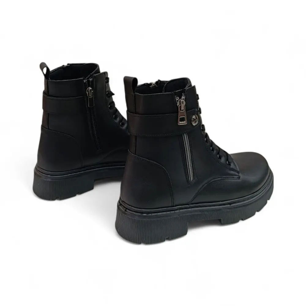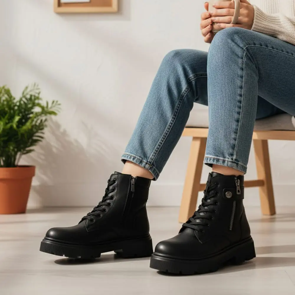Bu kısa bot modeli, kalın ve tırtıklı tabanı ile modern bir duruş sergilerken, zarif kemer ve toka detayları ile klasik postal stiline hareket katmaktadır. Sonbahar ve kış kombinlerinin vazgeçilmezi olan bu model, şıklığı ve fonksiyonelliği bir arada sunar.