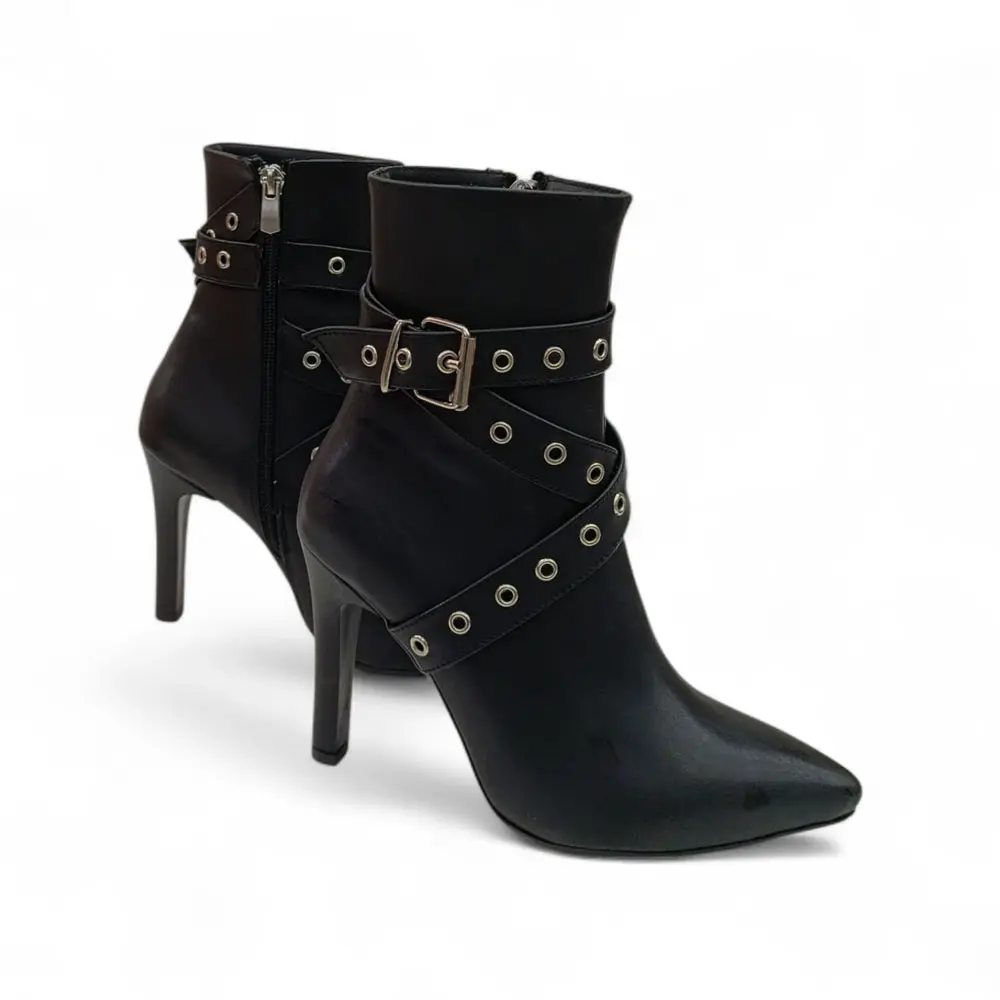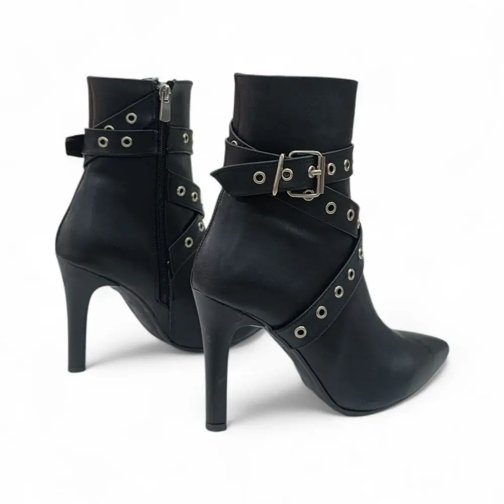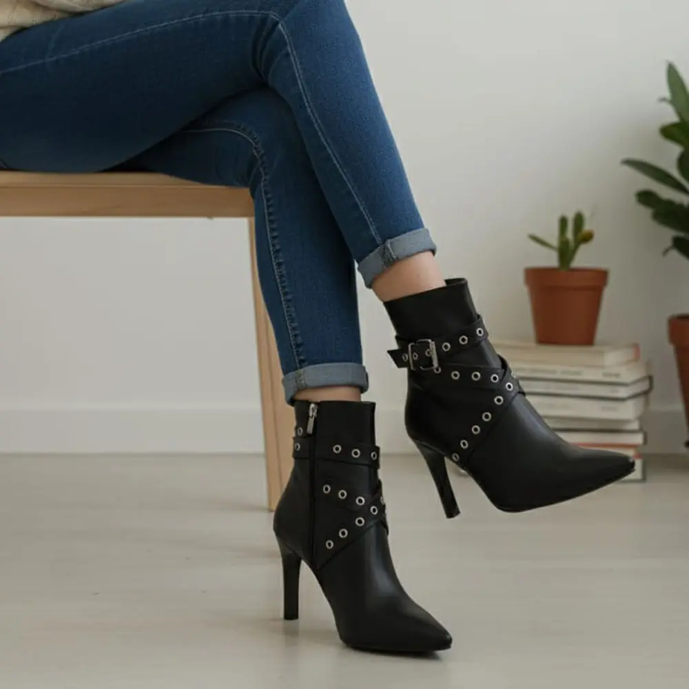 Asi Detaylar: Bilek kısmını saran çapraz bantlar üzerindeki metal kuşgözü (halka) ve ayarlanabilir toka detayları, modele rock chic ve asi bir hava katarak klasik topuklu botların dışına çıkarır.