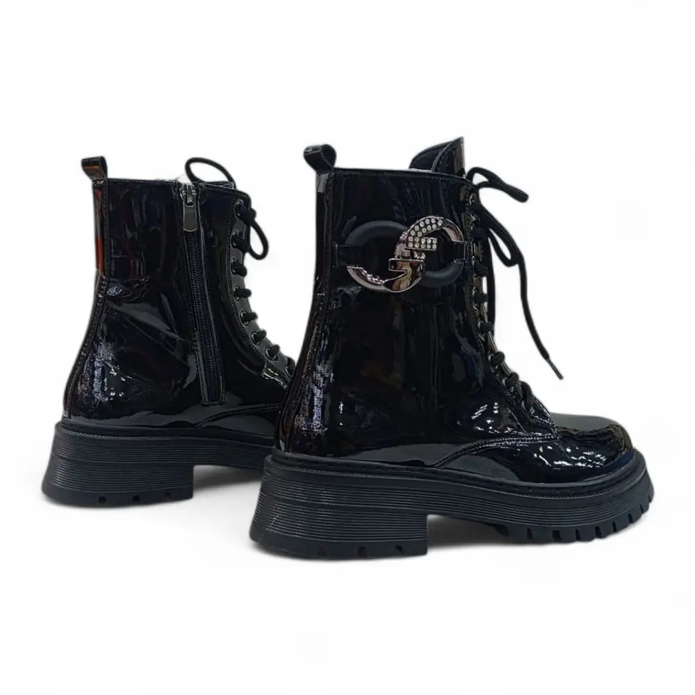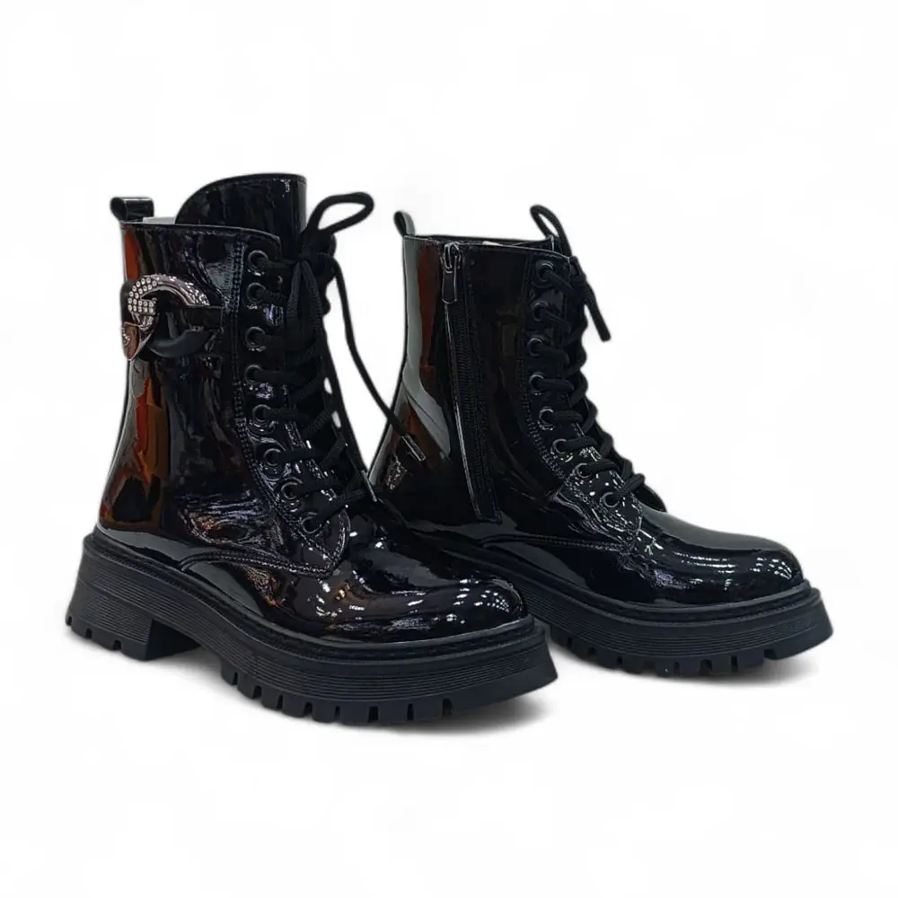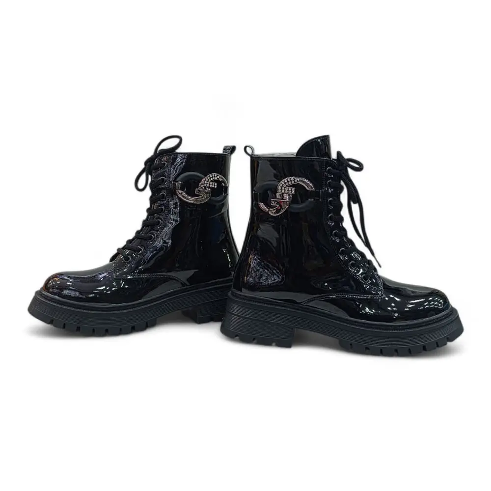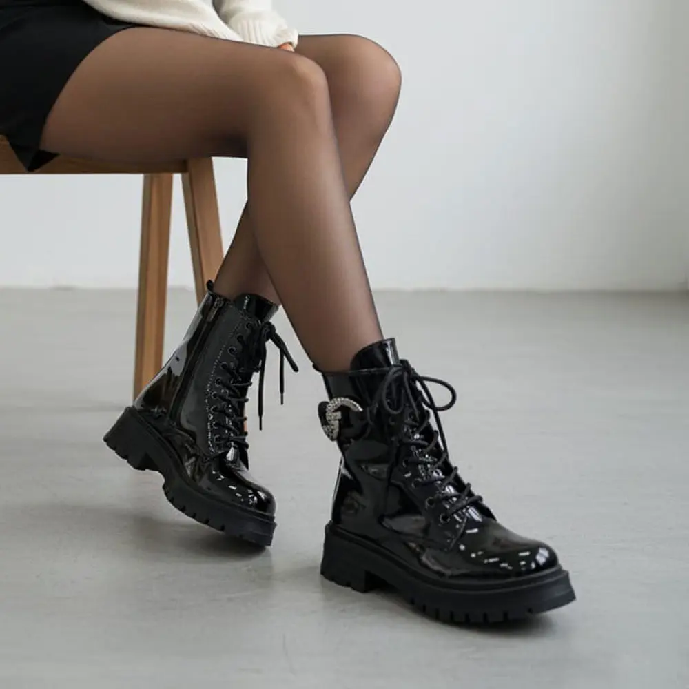 İddialı ve Modern Tasarım: Botun bilek kısmındaki parlak taşlı zincir (veya metal halka) detayı, klasik postal (combat) bot görünümüne lüks ve modern bir dokunuş katar. Kalın, tırtıklı (traktör) taban ise botun trend çizgisini pekiştirir.
