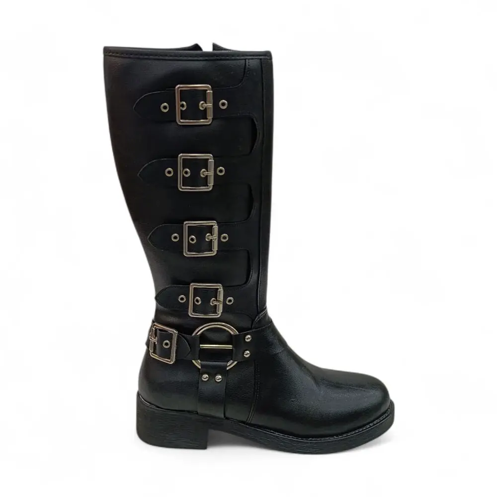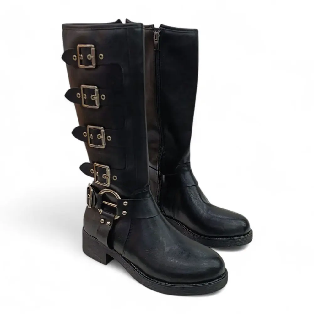Çoklu Toka Detaylı Diz Altı Kadın Çizme, klasik çizmelerin zarifliğini, asi metal tokaların dinamizmi ve kalın tabanın konforuyla birleştiriyor. Yüksek şıklığı ve güçlü karakteriyle, kış aylarında fark yaratmak isteyenler için mükemmel bir tercihtir.